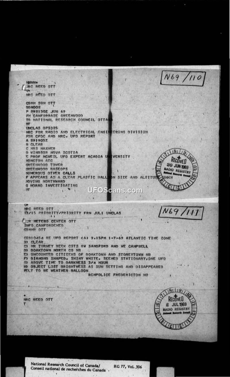 UFO Sighting Report — St. Phillips, Newfoundland, May 26, 1969