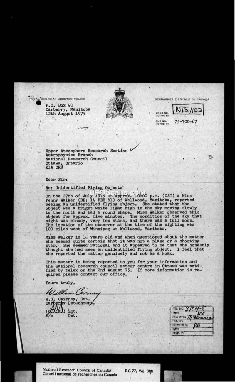 National Research Council of Canada UAP/UFO Sighting Reports (1975-1976)