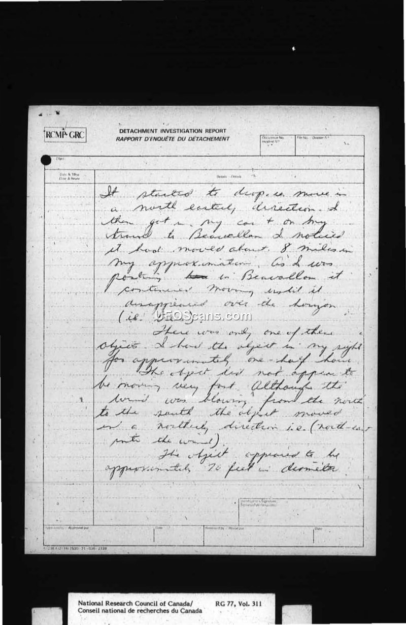 A district agriculturalist reported a circular, greyish-white object with a reddish bottom moving northerly over Myrnam, Alberta, on April 6, 1981. The object was estimated to be 70 feet in diameter and was observed for 30 minutes.