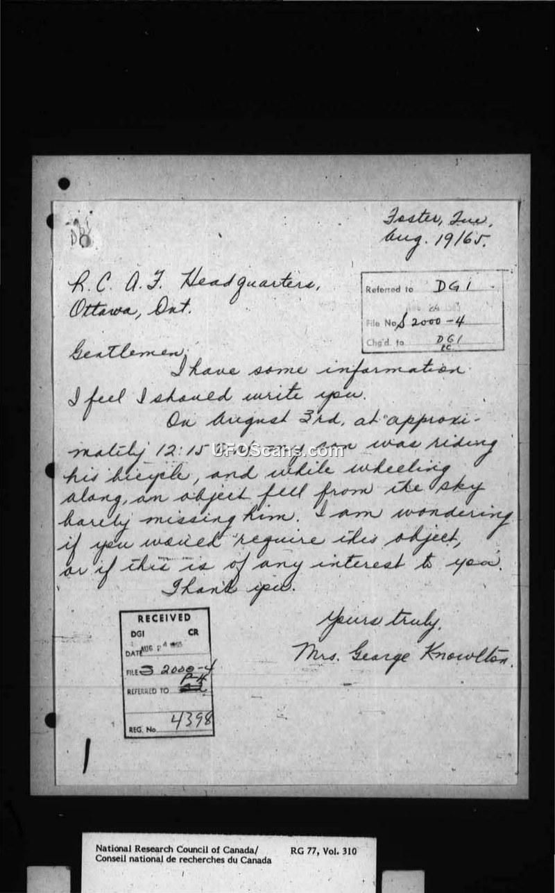 This document archive contains correspondence regarding a report from Mrs. George Knowlton of Foster, Quebec, who claimed that an object fell from the sky on August 3, 1965, nearly striking her son while he was riding his bicycle. The report was initially directed to the R.C.A.F. Headquarters in Ottawa and subsequently referred to the Directorate of General Intelligence (DGI). The military authorities requested that the local station investigate the incident, asking for details regarding potential aircraft or bird activity, weather conditions, and sounds. Following an examination of the object, it was determined to be an oil breather cap from a Vauxhall automobile. The military concluded that the object was man-made and, as it was no longer of interest to the DGI, it was returned to Mrs. Knowlton as a souvenir. The correspondence reflects the standard administrative procedure for handling civilian reports of unidentified objects during this period, including the involvement of the National Research Council of Canada.