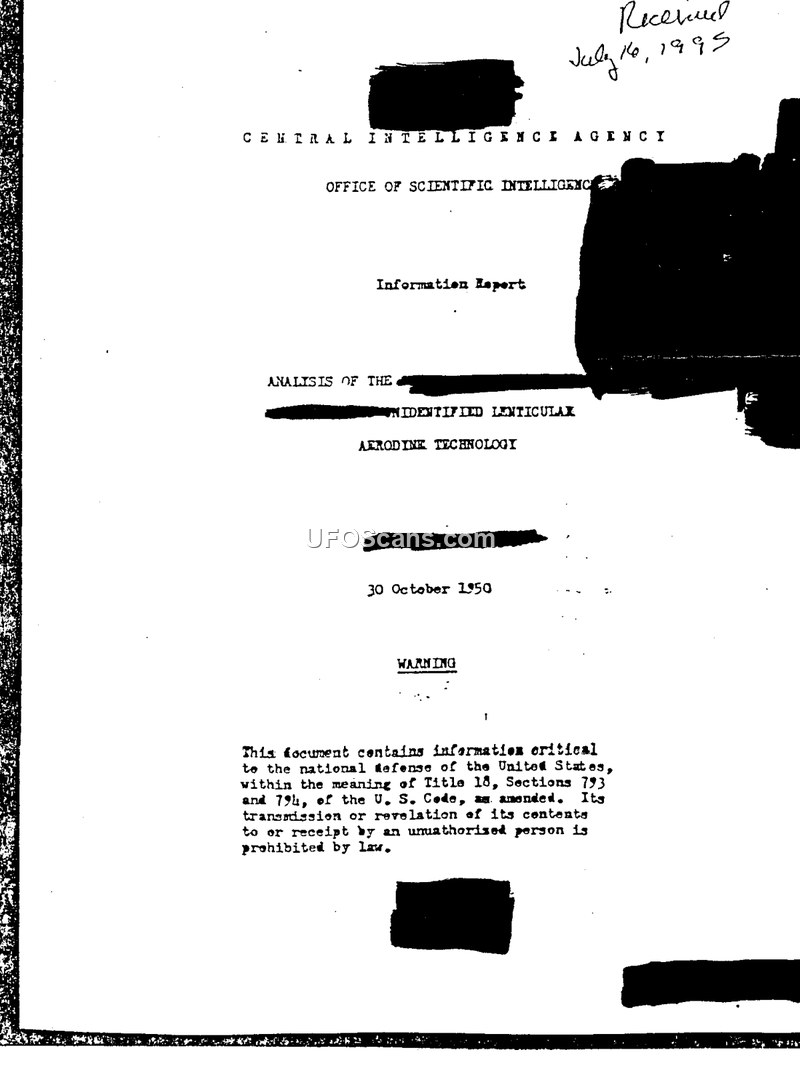 This document, dated 30 October 1950, is an intelligence report from the Central Intelligence Agency's Office of Scientific Intelligence regarding the analysis of recovered unidentified lenticular aerodyne technology. The report focuses on wreckage recovered from a crash site near Corona and Oscura Peak, New Mexico, in July 1947. The analysis covers flight dynamics, power plant and propulsion, construction, and avionics. The report references the Unidentified Lenticular Aerodyne Technology Transfer (ULATT) Exploitation Program and notes that a meeting was held at Blair House on 14 July 1949, where President Harry S. Truman proposed sharing the technology's 'know how' with Canada and the United Kingdom. Technical findings suggest that the craft utilizes a fusion reactor and travels by interacting with the planet's magnetic lines of force via an ionizing plasma. Structural analysis by the Air Material Command indicates the craft was not piloted by radio transmission, appears to be manually controlled, and features a 'seamless' construction. Dr. Hannes Alfven was consulted regarding his work on magnetohydrodynamics to explain the craft's propulsion mechanism.
