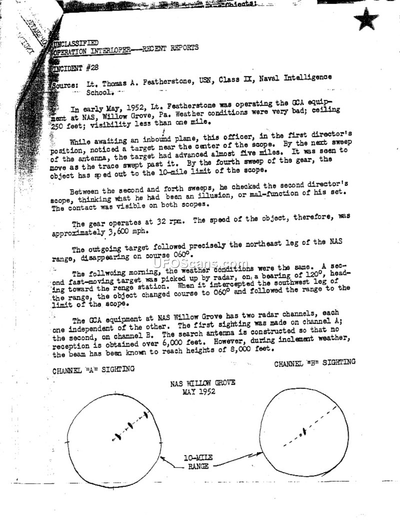 This document, titled Incident #28 under the Operation Interloper series, details a radar sighting reported by Lt. Thomas A. Featherstone of the USN, Class IX, Naval Intelligence School. In early May 1952, while operating GCA equipment at NAS Willow Grove, Pennsylvania, under poor weather conditions (250-foot ceiling and less than one mile visibility), Lt. Featherstone observed an unidentified target on his radar scope. The object was detected near the center of the scope and, by the fourth sweep of the radar, had moved to the 10-mile limit. Based on the equipment's 32 rpm rotation, the object's speed was calculated at approximately 3,600 mph. The target followed the northeast leg of the NAS range before disappearing on a 060-degree course. The contact was verified on both the primary and secondary director scopes. The following morning, a second fast-moving target was detected on a bearing of 120 degrees, heading toward the range station. Upon interception, this object also changed course to 060 degrees and followed the range to the limit of the scope. The report notes that the GCA equipment at NAS Willow Grove utilizes two independent radar channels, A and B, and that the search antenna is designed to prevent reception above 6,000 feet, though it can reach 8,000 feet during inclement weather.