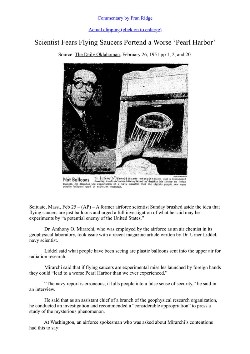 This document, a press clipping from The Daily Oklahoman dated February 26, 1951, details a public disagreement between former Air Force scientist Dr. Anthony O. Mirarchi and Navy scientist Dr. Urner Liddel regarding the nature of 'flying saucers.' Dr. Liddel had previously asserted that reported sightings were merely plastic balloons used for radiation research. Dr. Mirarchi, formerly an air chemist at an Air Force geophysical laboratory, publicly challenged this explanation. He argued that the objects exhibited 'maneuvered motion'—specifically vertical and horizontal movements—that were inconsistent with natural phenomena or drifting balloons. Mirarchi suggested that these objects might be experimental missiles launched by a foreign power, warning that they could portend a 'worse Pearl Harbor' than previously experienced. He noted that he had previously recommended a 'considerable appropriation' for a formal study of these phenomena. In response to Mirarchi's claims, an Air Force spokesman stated that after over 500 investigations, the service had found no concrete evidence to support the existence of flying saucers. However, the spokesman confirmed that the Air Force had not terminated its study of the rumors, which continued under the direction of Col. Harold E. Watson at the USAF Air Materiel Command center in Dayton, Ohio. Mirarchi further highlighted that many 'fireball' observations were concentrated near the Los Alamos atomic installation in New Mexico, a region he deemed critical to national interest.