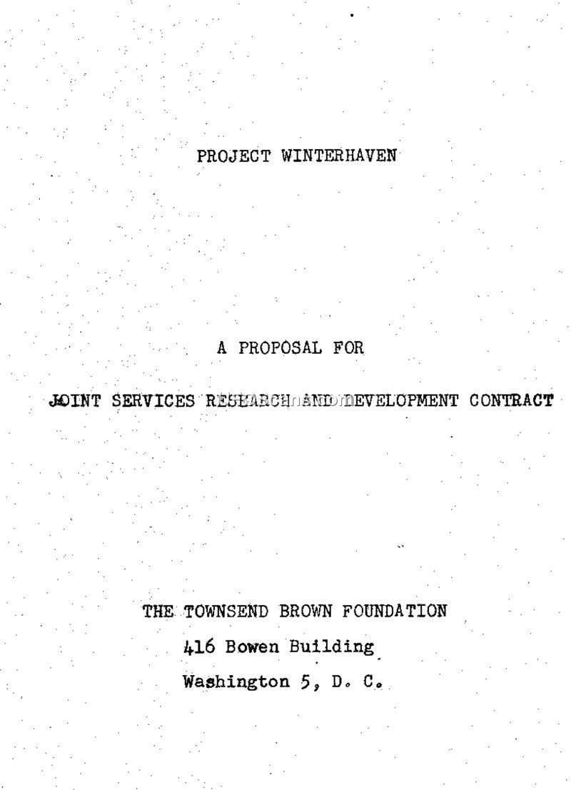 Project WINTERHAVEN is a formal proposal submitted by The Townsend Brown Foundation to the United States Department of Defense, dated January 1, 1953. The document outlines a comprehensive research and development program aimed at confirming and exploiting the suspected interrelationship between the electrodynamic and gravitational fields. The foundation argues that evidence gathered over several years suggests that this 'electro-gravitic' relationship can be manipulated to create a new form of propulsion and a revolutionary communication system. The proposal details a multi-institutional research effort involving four commercial corporations and four academic institutions, including Stanford Research Institute, the University of Chicago, and The Franklin Institute. The research program is divided into four main groups: field relationships, wave propagation, ponderomotive forces in solid dielectrics, and reactive forces in fluid dielectrics. A central component of the proposal is the development of disc-shaped airfoils that utilize high-voltage electrostatic charges to achieve thrust, which the authors claim could eventually lead to craft capable of exceeding 1,800 miles per hour. The document also discusses the potential for a new communication system that utilizes gravitational waves, which are described as being highly penetrating, capable of passing through steel shielding and concrete, and potentially useful for secure military communications. The proposal includes detailed appendices outlining specific fundamental research tasks, such as the repetition of the Trouton-Noble experiment and the use of liquid-helium cryostats to study low-temperature physics and dielectric properties. The document emphasizes the urgency of this research, comparing it to the Manhattan Project in its potential to revolutionize science and technology, and argues that the United States must prioritize the conquest of space through the control of gravitation.