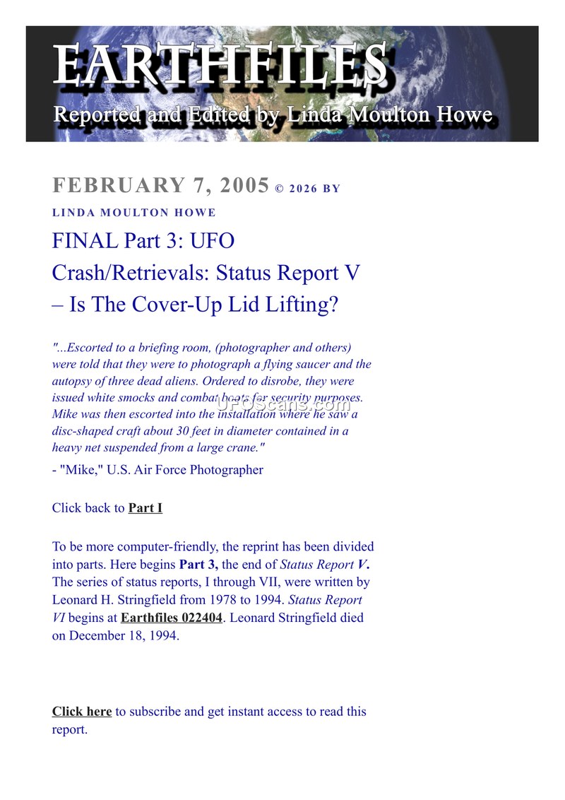 This document, published by Linda Moulton Howe on February 7, 2005, serves as a continuation of the UFO crash and retrieval status reports originally authored by Leonard H. Stringfield between 1978 and 1994. The text highlights testimonies regarding alleged government recovery operations of extraterrestrial craft and biological entities. One account features a U.S. Air Force photographer identified as 'Mike,' who claims to have been escorted into an installation to photograph a disc-shaped craft, approximately 30 feet in diameter, suspended by a crane, alongside the autopsy of three deceased aliens. Another account, attributed to an individual identified as 'T,' describes being shown a classified film at a base theater depicting a silver disc-shaped craft with a dome and hatch, followed by footage of military personnel and the bodies of two small, 'mongoloid'-looking entities in pastel-colored suits. 'T' reports that he was later instructed by an intelligence officer to consider the film a hoax. Additionally, the document references a 1953 incident at Fort Polk, Louisiana, where a source identified as 'H.J.' reported the crash of an egg-shaped UAP into soft soil, which prompted the deployment of a special detachment and an ambulance. The document serves as a repository for these historical claims, noting the death of Leonard Stringfield in 1994 and directing readers to his broader series of status reports.