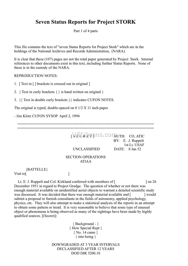 Project STORK was an ATIC-led scientific study aimed at statistically analyzing UFO sighting reports using a new coding system and consultant panel. The document includes progress reports from early 1952 and a sample observer data sheet from a 1948 incident.