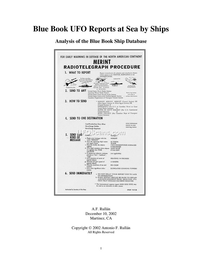 This document, authored by A.F. Rullán in 2002, provides a comprehensive analysis of UFO reports submitted by ships at sea to the United States Air Force's Project Blue Book between 1948 and 1968. The study focuses on reports from the Atlantic and Pacific Oceans, excluding coastal sightings, to better understand the mechanisms and quality of reporting by Navy, Coast Guard, and commercial vessels. The author generated a database of 258 ship-based UFO reports after screening over 14,000 entries in the Project Blue Book files. The analysis reveals that only 2% of these ship-based reports were ultimately classified as 'unknown' by Blue Book. The study highlights that the primary driver for the peak in reports during the early 1960s was the misidentification of satellites as UFOs, which accounted for 36% of all explanations given by Blue Book for ship reports. Other common explanations included insufficient information, meteors, and missile/rocket launches. The document examines the reporting instructions used, specifically JANAP-146 (MERINT reports) and OPNAV Instruction 3820. It concludes that these systems were designed as early warning mechanisms for national defense rather than for the scientific investigation of anomalous phenomena. Consequently, the quality of the data received was generally poor, with 64% of reports failing to meet minimum information requirements. The author notes significant inconsistencies in how different commands implemented reporting instructions, suggesting that the submission of reports was often more dependent on the individual ship's commander than on standardized military procedures. The study also provides detailed case studies of notable incidents, such as the MV Marcala sighting in 1950 and the USS Gyatt radar incident in 1964, to illustrate the challenges in evaluating these reports. Ultimately, the document argues that despite the existence of an extensive information tracking system, the military lacked the capability to effectively evaluate true anomalous sightings, and that poor training contributed to the flooding of reporting channels with identifiable objects.
