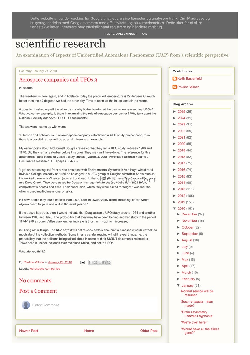 This document is a blog post dated January 23, 2010, authored by Pauline Wilson, which explores the historical involvement of aerospace companies in the study of Unidentified Anomalous Phenomena (UAP). The author argues that examining the past activities of these companies is valuable for identifying trends and behaviors, suggesting that if a company established a UFO study project once, they are likely to do so again. The post highlights McDonnell Douglas, noting that they conducted a UFO study between 1966 and 1970. Furthermore, the author references Jacques Vallee's 'Forbidden Science Volume 2' to support a claim that a UFO study group existed at Douglas Aircraft in Santa Monica as early as 1955. According to the account provided, this group included individuals such as Wheaten, Ted Gordon, Klemperer, and Dave Crook. They were tasked by Douglas management with assessing Project Blue Book cases, including photos and films. The group reportedly concluded that the objects involved utilized 'multi-dimensional physics,' a finding they were subsequently instructed to 'forget.' The account also claims that this group identified 2,000 sites in the Owen Valley where objects appeared to enter and exit solid ground. Finally, the author discusses the National Security Agency's (NSA) refusal to release certain documents, suggesting that some references to 'balloons' in SIGINT documents may actually refer to Taiwanese-launched balloons over mainland China rather than UFOs.