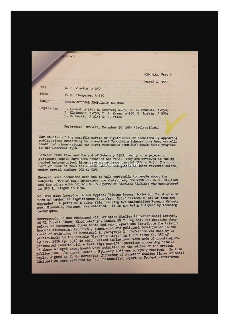 This memorandum, dated March 1, 1955, and authored by W. B. Klemperer, provides an update on the study of unconventional propulsion schemes. The document references a previous memorandum, MTM-622, and notes that twenty additional papers have been reviewed and added to the Astronautical Literature Review series (serials 026 to 045). The author reports on personal interviews conducted regarding the subject, specifically mentioning discussions with Dr. C. B. Millikan and Captain W. T. Sperry of American Airlines, the latter of whom encountered a UFO in 1950. The author dismisses the technical value of existing 'Flying Saucer' literature but notes the acquisition of a color film depicting unidentified objects near Missoula, Montana, which is currently undergoing analysis using 'Iconolog' techniques. Furthermore, the document details correspondence with Aviation Studies (International) Limited regarding the article 'Gravitic Steps' from their publication, which led to a referral to an unclassified report on Project Winterhaven.