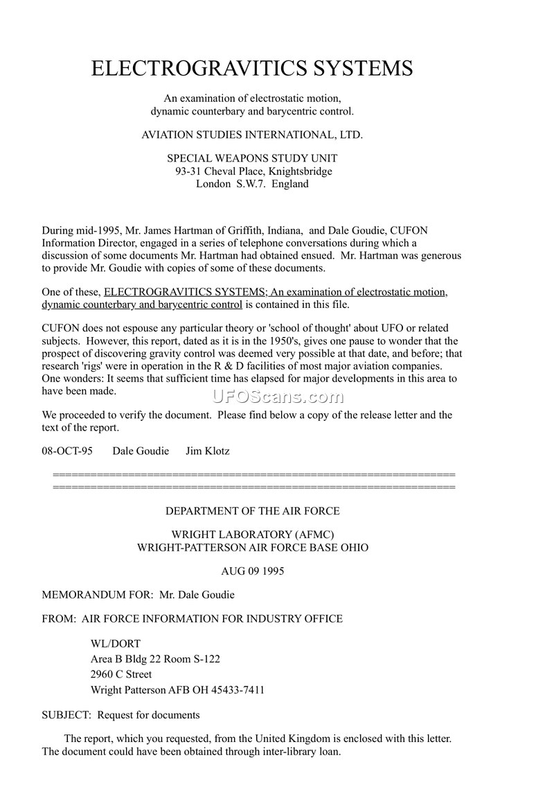 This document is a compilation of reports and correspondence regarding 'Electrogravitics Systems,' originally produced by Aviation Studies International, Ltd. in the 1950s and later provided to Dale Goudie of CUFON by the U.S. Air Force in 1995. The core report examines the theoretical and practical feasibility of using electrostatic energy for propulsion and gravity control, a field referred to as 'electrogravitics' or 'dynamic counterbary.' The document outlines the history of this research, specifically referencing 'Project Winterhaven' (1952), which proposed the development of a saucer-shaped interceptor capable of Mach 3 speeds by creating a local gravitational field. The report argues that while traditional aviation relies on aerodynamic lifting surfaces, electrogravitics offers a fundamentally different approach by manipulating gravitational force lines. It discusses the role of high-dielectric materials (high-k) and the need for massive electrical power, comparing the potential effort required to the Manhattan Project. The text lists numerous U.S. and international companies, including Douglas, Convair, Bell, and General Electric, that were reportedly investigating these technologies in the mid-1950s. It also highlights the importance of fundamental physics, specifically the work of Einstein, Dirac, and Hlavaty, and the ongoing search for high-energy particles like the anti-proton. The document concludes that while no practical gravity control has been achieved, the potential rewards for transportation are immense. It suggests that the path forward requires a synthesis of nuclear and electromagnetic research, and that the companies most likely to succeed are those with significant computational and laboratory resources. The document also includes an extensive list of electrostatic patents from the U.S., Britain, and France, demonstrating the breadth of interest in electrostatic technology during that era.