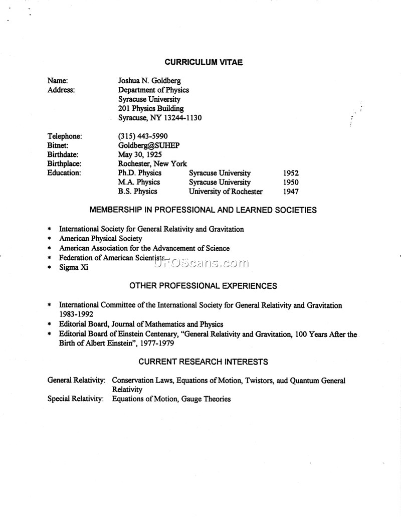 This document is the curriculum vitae of physicist Joshua N. Goldberg, who worked at Wright-Patterson Air Force Base's Aerospace Research Laboratories from 1956 to 1963. The archive context suggests potential, though unconfirmed, links between his work on gravitation and UAP-related research.