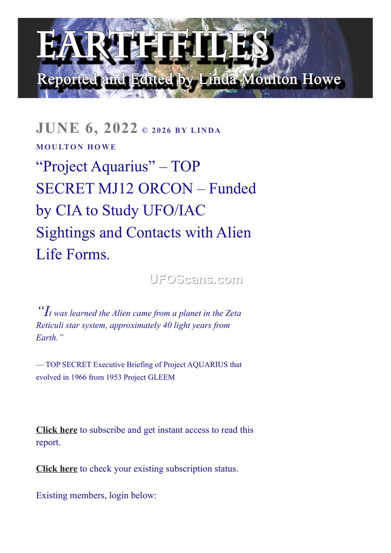 This document, published by Linda Moulton Howe on June 6, 2022, serves as a report on 'Project Aquarius,' a classified initiative described as a TOP SECRET MJ12 ORCON project funded by the CIA. The primary objective of Project Aquarius was the study of UFO and IAC (Identified Alien Craft) sightings, as well as contacts with alien life forms. According to the document, Project Aquarius evolved in 1966 from an earlier 1953 initiative known as Project GLEEM. The text cites a 'TOP SECRET Executive Briefing' which claims that it was learned that the aliens involved in these contacts originated from a planet in the Zeta Reticuli star system, located approximately 40 light years from Earth. The document also references a 1958 incident involving an anonymous military source who reported that a UAP was purposefully landed in the southwest corner of Hill Air Force Base, with the craft's door left open for USAF personnel to take custody. Additional keywords and projects associated with this briefing include Project BANDO, Project POUNCE, Project SIGMA, Project SNOWBIRD, and mentions of Betty and Barney Hill, as well as amateur astronomer Marjorie Fish.