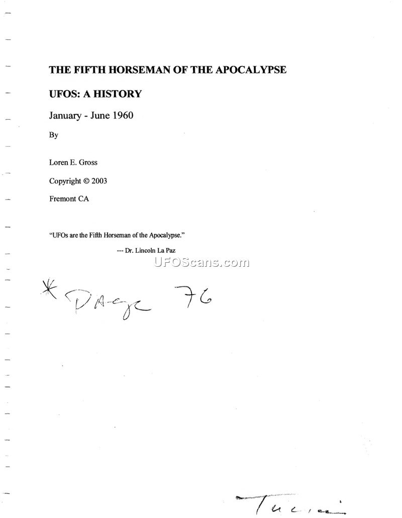 This document is a historical compilation by Loren E. Gross, titled 'The Fifth Horseman of the Apocalypse: UFOS: A History, January - June 1960.' It provides a detailed, chronological account of UFO sightings, government correspondence, and public discourse regarding Unidentified Aerial Phenomena during the first half of 1960. The text documents numerous specific incidents globally, including sightings in Australia, the United States, Brazil, and England. A significant portion of the document focuses on the tension between civilian UFO research organizations, specifically NICAP and APRO, and the United States Air Force, particularly regarding the handling of Project Blue Book files and the release of information to the public. The document highlights the efforts of figures such as Major Lawrence J. Tacker, Dr. J. Allen Hynek, and Admiral R. H. Hillenkoetter in the ongoing debate over UFO transparency and national security. It also includes transcripts of internal Air Force memoranda, correspondence between researchers and military officials, and press clippings that illustrate the public's growing interest and the military's attempts to manage or dismiss these reports. The compilation serves as a primary source record of the UFO phenomenon's cultural and political impact during this period, emphasizing the persistent, often adversarial, relationship between civilian investigators and government agencies.