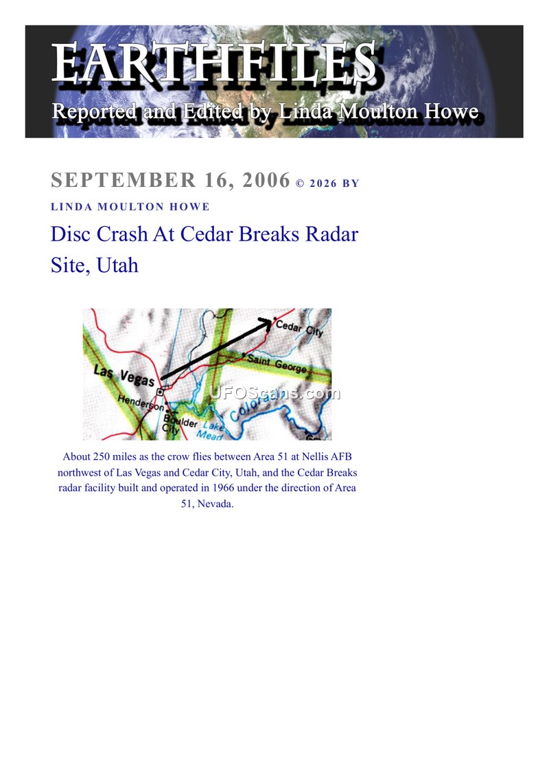 This document, published by Linda Moulton Howe on September 16, 2006, via the Earthfiles platform, reports on an alleged disc crash that occurred in 1966. The incident reportedly took place at the Cedar Breaks radar facility in Utah. According to the report, the facility was built and operated in 1966 under the direction of Area 51, located approximately 250 miles away at Nellis Air Force Base. The primary source for this claim is identified as a radar technician, described as the father of an individual named 'Paul' residing in Michigan. The document serves as an introduction to a subscription-based report, soliciting further information from the public regarding extraterrestrial biological entities and crashed discs.