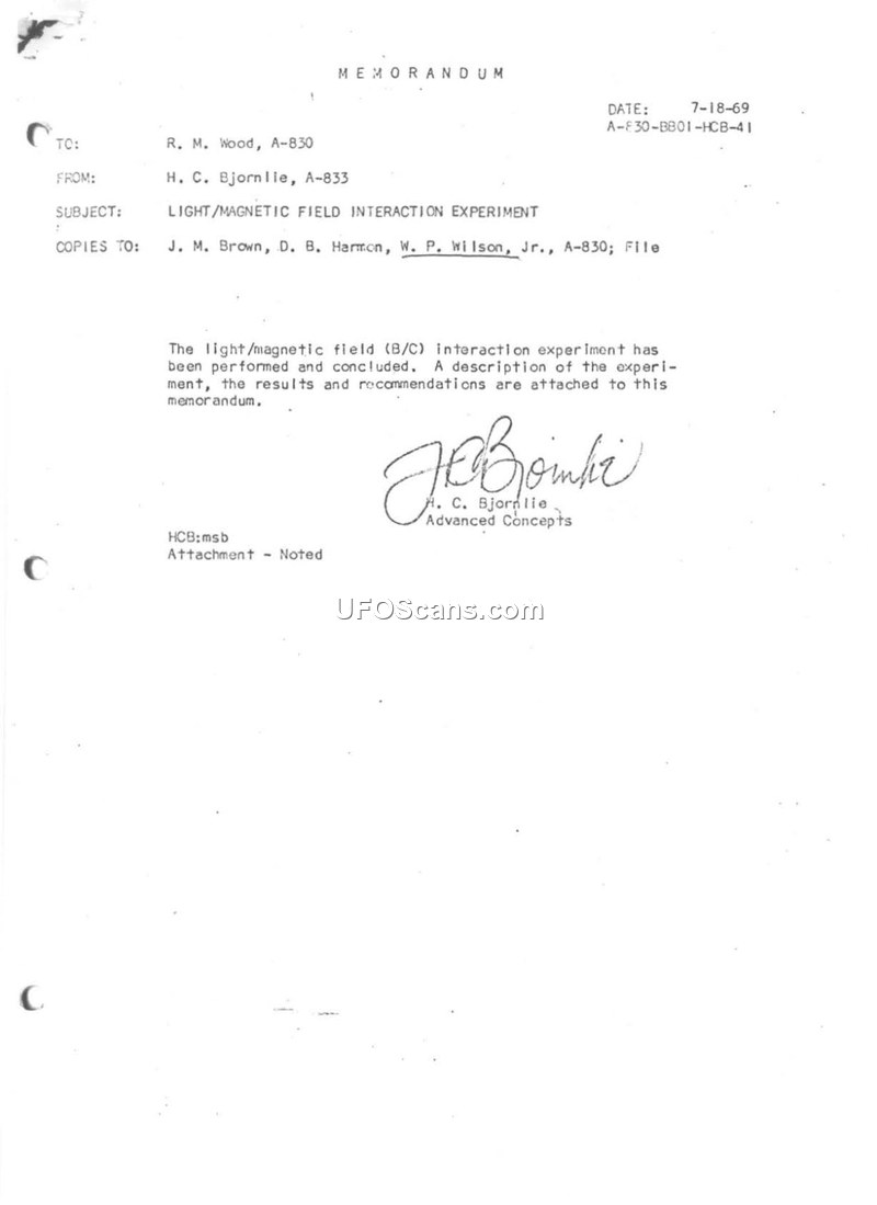 This document is a memorandum dated June 27, 1968, from J. M. Brown of the McDonnell Douglas Astronautics Company to R. M. Wood. It serves as a core description of the 'Vehicle R&D Program,' also referred to as 'Project BITBR.' The memorandum outlines the technical background and immediate future efforts of the Advanced Concepts research team, which began in May 1968. The program is built upon the 'kinetic particle theory of physics,' which posits that space and time are absolute and that all matter and forces are produced by particle collisions. The research aims to rigorously test this theory through 'lumped-parameter analysis' and laboratory experiments. A significant portion of the document discusses the potential for gravitational control and matter annihilation as propulsion concepts, noting that high magnetic fields are a common feature in UFO reports and are presumed to be connected to propulsion systems. The document also details an ancillary approach to vehicle design, which involves studying UFO observations for potential design clues, assuming some UFOs are extraterrestrial vehicles. The program includes plans for laboratory experiments, such as measuring the effect of magnetic fields on the velocity of light, and the development of a continuum equation to represent the characteristics of basic particles. The memorandum concludes by identifying immediate priorities for the research team, including the continuum equation analysis, generation of high magnetic fields, and the systematic compilation of UFO literature.