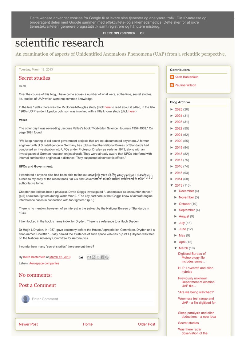 This document is a blog post dated March 12, 2013, by Keith Basterfield, exploring the existence of historical 'secret studies' regarding Unidentified Anomalous Phenomena (UAP). The author references Jacques Vallee's book, 'Forbidden Science: Journals 1957-1969,' which contains an account from a former U.S. Intelligence engineer. This engineer claimed that the National Bureau of Standards (now NIST) conducted an investigation into UFOs as early as 1943 under the direction of Professor Hugh L. Dryden. This alleged study reportedly examined German jet aircraft research and noted that UFOs were observed to interfere with internal combustion engines at a distance, with investigators suspecting electrostatic effects. Basterfield cross-references this claim with the book 'UFOs and Government,' which discusses physicist David Griggs' investigation into 'foo-fighters' during World War II and his knowledge of aircraft engine interference. However, the author notes that 'UFOs and Government' does not mention the National Bureau of Standards' involvement in 1943. The post concludes by noting that Dr. Hugh L. Dryden, later associated with NACA and NASA, testified before the House Appropriation Committee in 1957, where he and an individual named Doolittle denied the existence of such space vehicles. The author questions how many other undocumented 'secret studies' may exist.