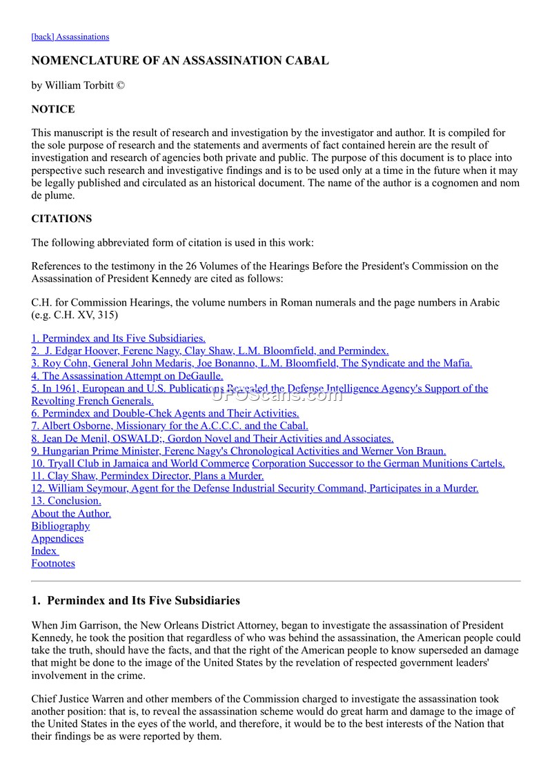 This manuscript, titled 'Nomenclature of an Assassination Cabal' by William Torbitt, presents a detailed, albeit highly controversial, theory regarding the assassination of President John F. Kennedy. The author asserts that the assassination was not the act of a lone gunman, but a coordinated conspiracy orchestrated by a secret, high-level policy agency known as the Defense Industrial Security Command (DISC). According to the text, DISC functioned as a clandestine police and espionage arm for the U.S. munitions and aerospace industries, operating under the dual leadership of Division Five of the FBI and the Defense Intelligence Agency. The author claims that DISC was kept secret from most U.S. officials and Congressmen, and that it served the interests of a powerful cabal of government leaders, military figures, and industrial financiers. The document identifies numerous individuals as members of this cabal, including J. Edgar Hoover, Lyndon Johnson, Wernher Von Braun, and various Mafia figures. It alleges that these individuals used front organizations such as Permindex and the American Council of Christian Churches to carry out their objectives, which included not only the assassination of President Kennedy but also attempts on the life of French General Charles DeGaulle. The author argues that Lee Harvey Oswald was a scapegoat, and that other individuals, such as William Seymour, were used to impersonate him and fabricate evidence to implicate him in the crime. The text further claims that the Warren Commission's findings were intentionally misleading and that evidence was suppressed to protect the conspirators. The author relies on various citations, including volumes of the Warren Commission Hearings, to support these claims, and suggests that the same cabal was responsible for the assassinations of Martin Luther King, Jr. and Robert F. Kennedy. The manuscript concludes by calling for a 'cleansing catharsis' through the application of criminal law to those involved in the cabal, arguing that such action is necessary to restore the moral balance of the nation.