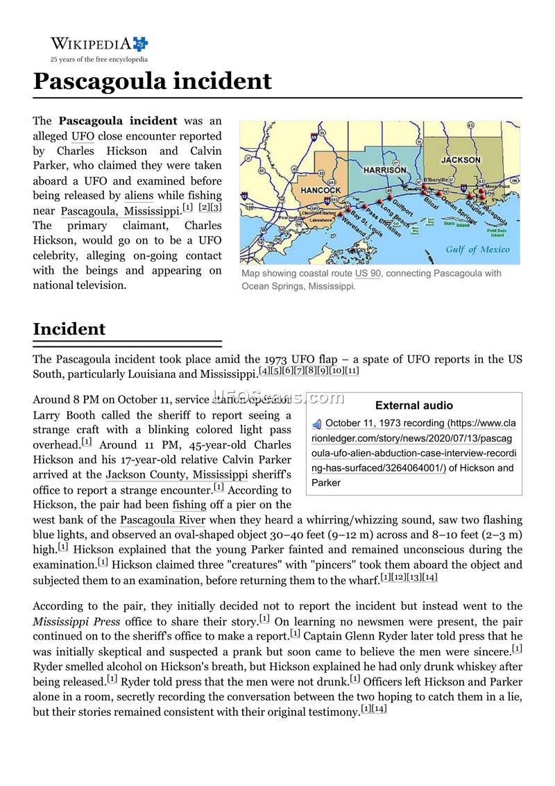 The Pascagoula incident refers to an alleged UFO close encounter that occurred on the night of October 11, 1973, near the Pascagoula River in Mississippi. Two men, 45-year-old Charles Hickson and his 17-year-old relative Calvin Parker, reported that while fishing off a pier, they observed an oval-shaped object, approximately 30–40 feet across and 8–10 feet high, emitting a whirring sound and flashing blue lights. According to their account, three 'creatures' with 'pincers' emerged from the craft, took them aboard, and subjected them to an examination before returning them to the wharf. Parker reportedly fainted during the encounter. The men initially attempted to report the incident to the Mississippi Press before contacting the Jackson County sheriff's office. Captain Glenn Ryder, the investigating officer, was initially skeptical, suspecting a prank, but later expressed that he believed the men were sincere, noting that they remained consistent in their stories even when left alone in a room where they were secretly recorded. The case gained significant national attention, leading to examinations at Keesler Air Force Base, where the men were cleared of radiation exposure. Various figures, including ufologist James Harder and J. Allen Hynek, interviewed the men under hypnosis. Over the following years, Hickson became a 'UFO celebrity,' appearing on national television and claiming ongoing contact with the beings. Skepticism persisted, with aviation journalist Philip J. Klass labeling the case a hoax, citing discrepancies and Hickson's refusal to take a polygraph exam from an experienced examiner. Skeptical investigator Joe Nickell suggested that Hickson may have experienced a hypnagogic 'waking dream state' and that Parker's corroboration was a result of suggestibility. Both men have since passed away, and the incident remains a notable event in UFO lore, marked by a historical marker at the site and an annual festival in Pascagoula.