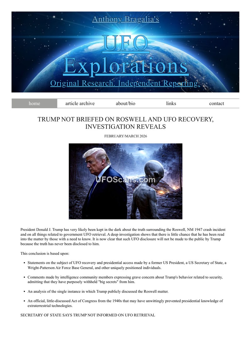 This article, published by UFO Explorations in February/March 2026, presents an investigation into whether former President Donald J. Trump was ever briefed on the 1947 Roswell, New Mexico crash or subsequent government UFO retrieval programs. The author, Anthony Bragalia, argues that it is highly improbable that Trump was ever read into these matters. The article cites several lines of reasoning to support this conclusion. First, it references statements from various officials, including Secretary of State Marco Rubio, who suggested in the documentary 'The Age of Disclosure' that elite programs often restrict information flow even from the commander-in-chief. Second, it highlights the concerns of intelligence community members regarding Trump's security practices, noting that officials purposely withheld sensitive information from him due to fears of leaks. Third, the article analyzes a 2020 podcast interview where Trump discussed Roswell, concluding that his vague, teasing responses indicated a lack of genuine knowledge rather than the possession of secret information. Finally, the document discusses structural barriers to presidential access, specifically the Atomic Energy Act, which places certain nuclear-related technology secrets under the jurisdiction of the Department of Energy, potentially bypassing presidential oversight. The article also recounts the experiences of former President Bill Clinton, who expressed frustration at his own inability to uncover the truth about Roswell, and cites testimony from former Brigadier General Arthur Exon, who claimed that elected officials were excluded from the 'Unholy 13' group that controlled access to Roswell-related information. The document concludes that the intelligence and military establishment maintains a 'government inside the government' that operates independently of presidential control, particularly regarding matters of extreme scientific and strategic importance.