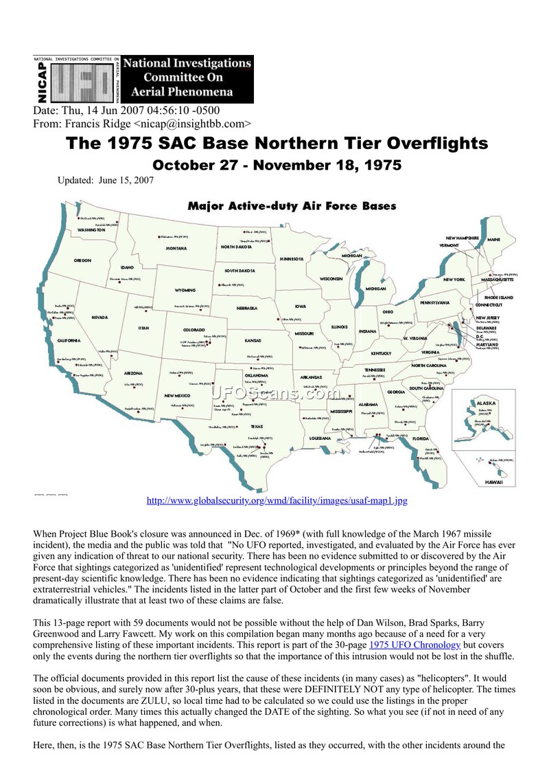 This report, compiled by Francis Ridge of NICAP, documents a series of unidentified aerial phenomena (UAP) incidents occurring between October 27 and November 18, 1975. The primary focus is on intrusions at Strategic Air Command (SAC) bases, specifically Loring Air Force Base in Maine, Wurtsmith Air Force Base in Michigan, and Malmstrom Air Force Base in Montana. These bases were critical components of the U.S. nuclear deterrent, housing nuclear weapons and ICBM facilities. The document argues that the official Air Force explanation, which frequently attributed these sightings to helicopters, is false. The author highlights the performance capabilities of the observed objects—such as extreme speeds, silent flight, and erratic maneuvers—as evidence that they were not conventional aircraft. The report details numerous sightings by military personnel, including security police and radar operators, who observed objects hovering near restricted weapons storage areas. In several instances, these sightings were accompanied by electromagnetic effects, such as the failure of vehicle engines and lights, and the stopping of watches. The document also notes that NORAD radar tracked these objects, and in some cases, fighter interceptors were scrambled, though they were unable to make contact. The report also references related incidents in Canada and other parts of the United States, as well as famous abduction cases involving Travis Walton and David Stephens, noting their proximity in time and location to the base overflights. The author expresses significant skepticism regarding the Air Force's handling of these events, suggesting that records were deliberately destroyed or that the military failed to adequately address the national security implications of these intrusions.