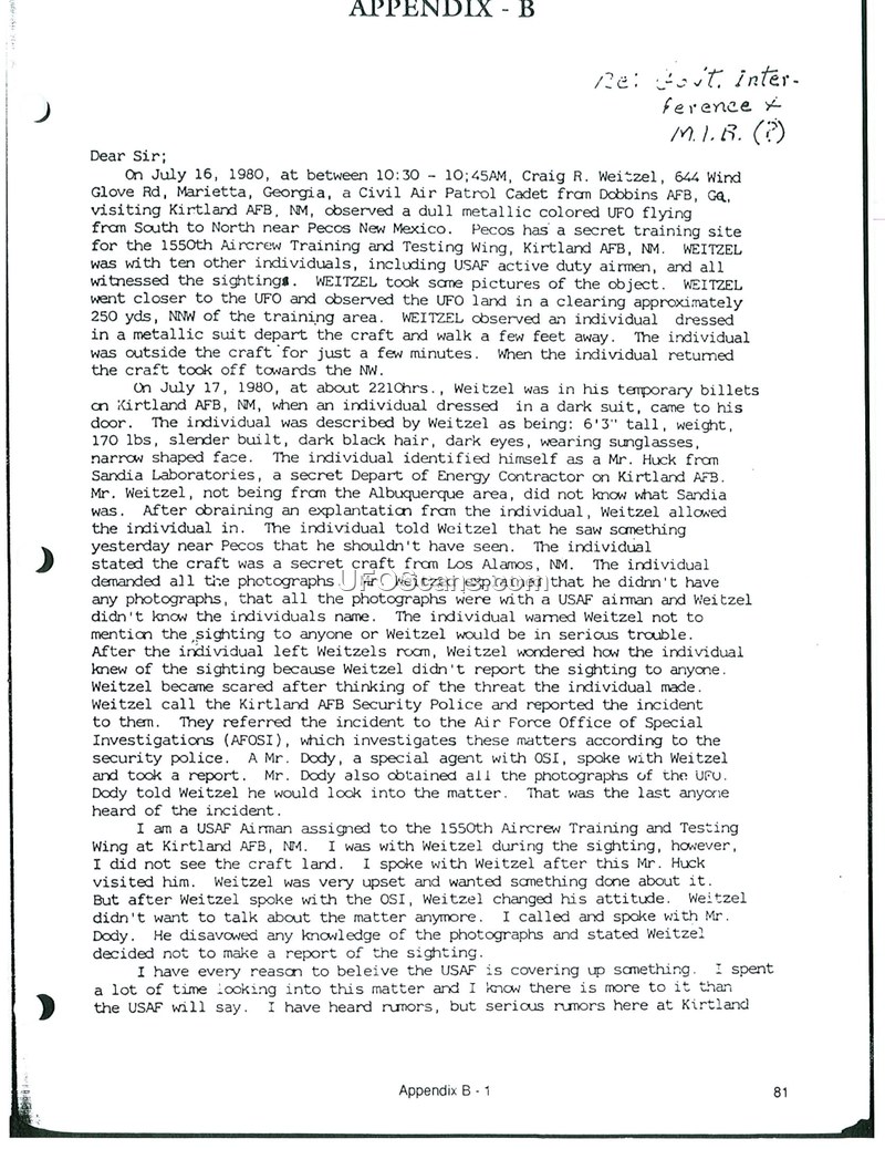 This document consists of a letter detailing an alleged UFO sighting on July 16, 1980, near Pecos, New Mexico, by Civil Air Patrol Cadet Craig R. Weitzel. According to the account, Weitzel and ten other individuals, including USAF personnel, observed a dull metallic craft flying from South to North. Weitzel reportedly took photographs of the object after it landed in a clearing. The narrative claims that on the following day, an individual identifying himself as Mr. Huck from Sandia Laboratories visited Weitzel at his temporary billets at Kirtland AFB. Huck allegedly claimed the craft belonged to Los Alamos National Laboratories, demanded the photographs, and threatened Weitzel with serious trouble if he spoke of the incident. The letter further states that the Air Office of Special Investigations (AFOSI) became involved, confiscated the photographs, and subsequently pressured Weitzel to remain silent. The author of the letter, identifying as a USAF airman, expresses a belief that the USAF is covering up the existence of crashed UFOs stored at the Manzano Storage area at Kirtland AFB. The author also claims that AFOSI has been conducting a secret investigation into UFOs and cattle mutations since the closure of Project Blue Book. The document concludes with the author stating they are remaining anonymous due to fear of retaliation.