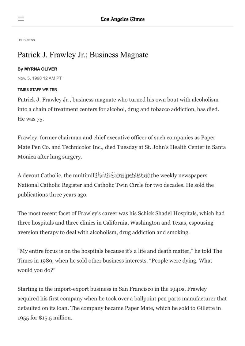 This document consists of an obituary for Patrick J. Frawley Jr., a prominent business magnate who died on November 3, 1998, at the age of 75. Frawley was known for his leadership roles at companies such as Paper Mate Pen Co., Technicolor Inc., and the Schick Safety Razor Co. He later focused his career on addiction treatment through his Schick Shadel Hospitals, which utilized aversion therapy. Born in Nicaragua, Frawley served in the Royal Canadian Air Force before settling in California and becoming a U.S. citizen in 1958. The archival context provided alongside the obituary highlights Frawley's connections to various organizations and figures relevant to UAP-related discourse. Specifically, it notes that Frawley was a co-founder of Sunn Classic Pictures, a production company that released the 1980 film 'Hangar 18,' which depicted a government cover-up of a crashed UAP. The archive suggests that Frawley, a member of the Sovereign Military Order of Malta (SMOM), maintained ties to individuals within the CIA and the American Security Council. The document further references claims made by Col. Philip Corso regarding the encouragement of film production for disclosure purposes and links Sunn Classic Pictures' output—including films about Noah's Ark, psychic phenomena, and ancient aliens—to the broader cultural and intelligence landscape of the era, including the predecessor programs of Project Star Gate.