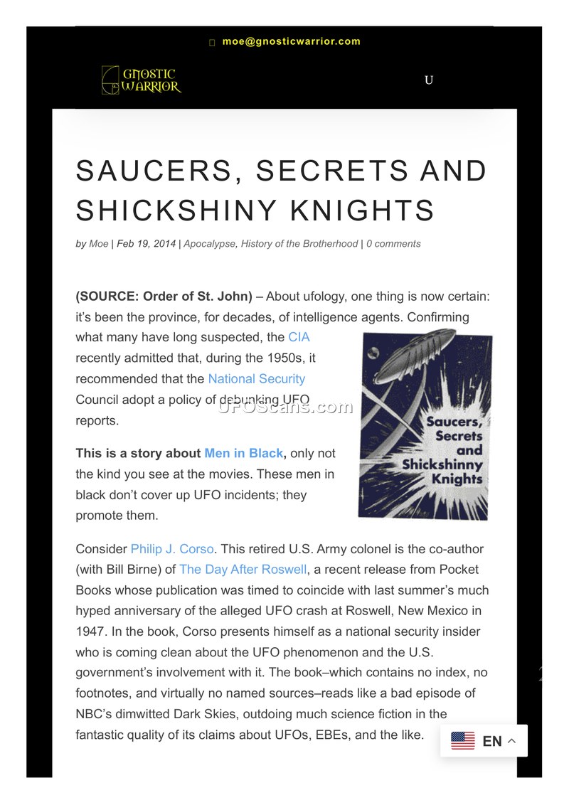 This article, published on GnosticWarrior.com in 2014, examines the intersection of ufology, intelligence agencies, and political extremism. The author, Moe, posits that the study of UFOs has long been influenced by intelligence agents, citing a CIA admission from the 1950s regarding a policy to debunk UFO reports to prevent public hysteria that could interfere with Cold War security. The article focuses heavily on Philip J. Corso, a retired U.S. Army colonel and co-author of 'The Day After Roswell.' The author characterizes Corso's claims—which include overseeing the handling of alien material and the development of modern technology from recovered debris—as lacking evidence and resembling science fiction. The author suggests that Corso may be a 'disinformation specialist' or a 'provocateur' whose work serves to discredit serious inquiry into UFOs. Furthermore, the article explores Corso's background, noting his membership in the 'Sovereign Order of Saint John of Jerusalem,' also known as the 'Shickshinny Knights of Malta.' This group is described as a fanatical, ultra-rightist organization with ties to figures like General Charles Willoughby and various anti-communist movements. The author argues that Corso's narrative aligns with a broader pattern of right-wing conspiracy theories that seek to alienate the public from the government and promote distrust of 'liberal' elements within the intelligence community. The article concludes by suggesting that the national security establishment may have moved beyond simple debunking to actively fomenting confusion or using UFO narratives as a 'smokescreen' for secret military developments, such as those at Area 51. By linking Corso to the militia subculture and other conspiracy-oriented groups, the author frames the modern UFO phenomenon as a tool for political manipulation rather than a genuine scientific or extraterrestrial mystery.