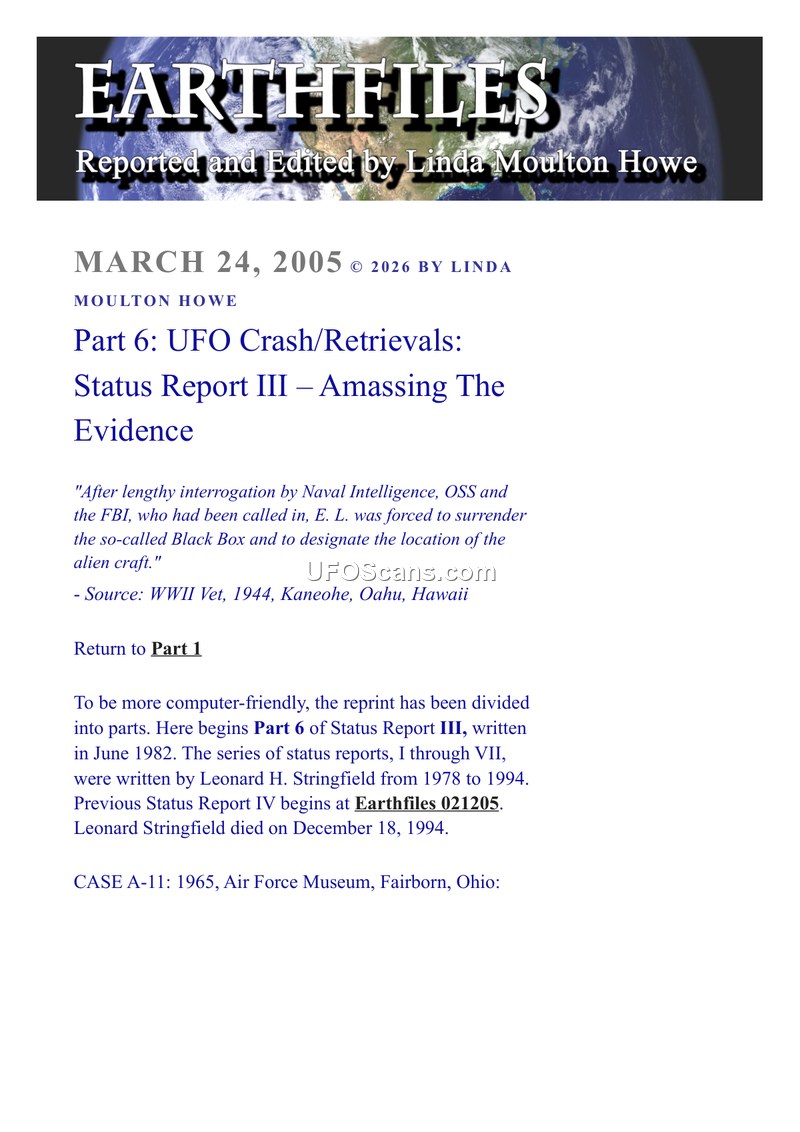 This document, published on March 24, 2005, by Linda Moulton Howe, serves as Part 6 of a series titled 'UFO Crash/Retrievals: Status Report III.' The content is a compilation of historical accounts regarding alleged UFO crash retrievals, originally documented by Leonard H. Stringfield between 1978 and 1994. The text highlights specific anecdotal evidence, including a 1944 incident in Kaneohe, Oahu, Hawaii, involving a WWII veteran identified as 'E. L.' who was allegedly interrogated by Naval Intelligence, the OSS, and the FBI regarding a 'Black Box' and the location of an alien craft. Additionally, the document references 'CASE A-11' from 1965 at the Air Force Museum in Fairborn, Ohio, and includes a separate case, 'CASE #330,' which details an account from the daughter of an individual identified as 'YR.' According to this account, 'YR' worked for General Electric and was taken to an underground level at Wright-Patterson Air Force Base (WPAFB). There, he reportedly witnessed a morgue containing glass cases with short, reptilian-like humanoids characterized by clammy skin, frog-like heads, and webbed hands. The document functions as a repository for these claims, emphasizing the ongoing effort to amass evidence regarding crash retrieval operations.