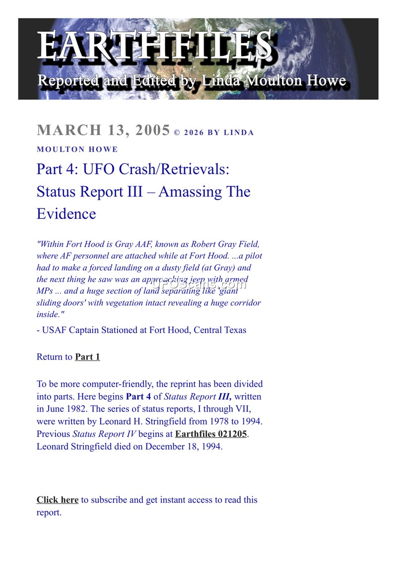 This document, published by Linda Moulton Howe on March 13, 2005, serves as a reprint of Part 4 of Leonard H. Stringfield's 'Status Report III: Amassing The Evidence,' originally written in June 1982. The report is part of a series of seven status reports authored by Stringfield between 1978 and 1994 concerning UFO crash and retrieval incidents. The text includes a specific account from a USAF Captain stationed at Fort Hood, Texas. The Captain describes an incident at Gray Army Airfield (Robert Gray Field) where a pilot, forced to land on a dusty field, observed an approaching jeep with armed military police. The pilot then witnessed a section of land separating like 'giant sliding doors,' with the vegetation remaining intact, to reveal a large corridor beneath. Additionally, the document provides context regarding a USAF Colonel identified as 'RC,' the founder of a UFO research group called APRON. According to the text, RC reported that his fiancé's car was forced off the road in Las Vegas and his apartment was burglarized, with Stringfield's books being the specific items stolen. RC later moved to Pensacola, Florida, where his fiancé was killed in a hit-and-run car crash. RC reportedly agreed to meet three men at an airport to discuss UFOs but subsequently ceased all contact with Stringfield.