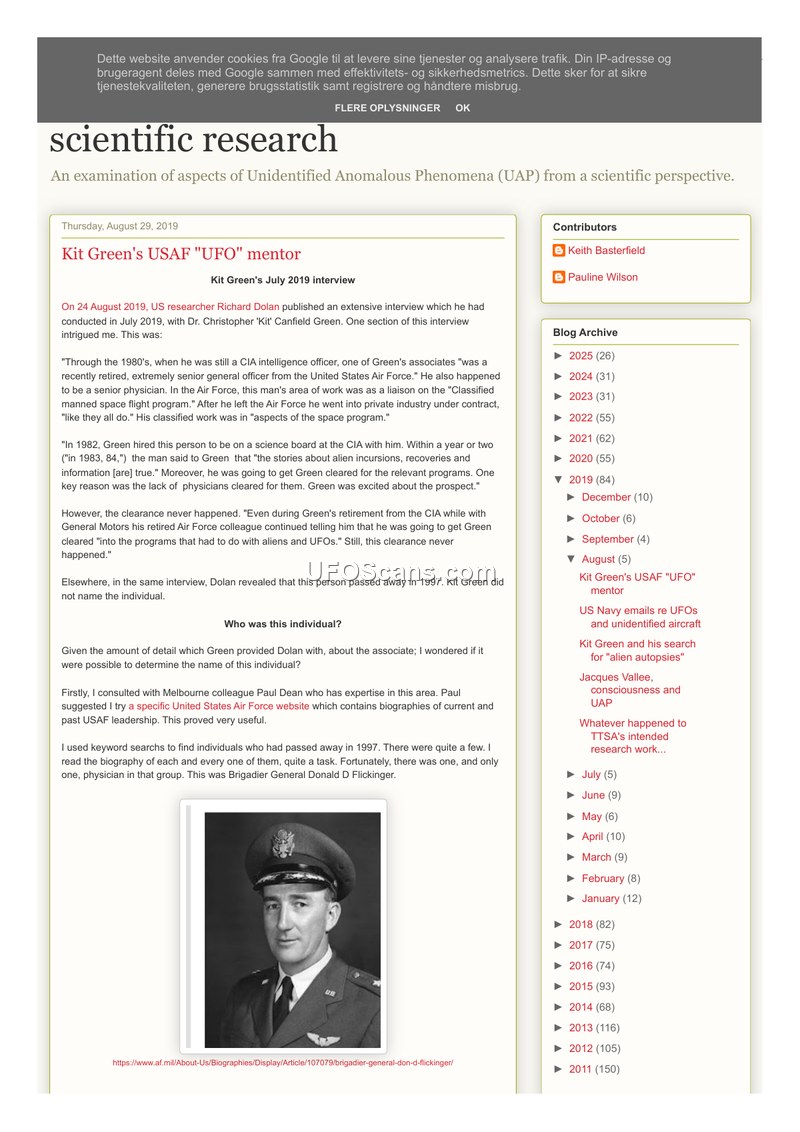 This document is a blog post by Keith Basterfield, dated August 29, 2019, which investigates the identity of an unnamed associate of Dr. Christopher 'Kit' Canfield Green. In a July 2019 interview with researcher Richard Dolan, Green described a retired, senior USAF general officer and physician who, during the 1980s, claimed that information regarding alien incursions and recoveries was true. This associate allegedly promised to secure security clearances for Green to access these programs, though the clearance never materialized. The associate passed away in 1997. Basterfield, with assistance from Paul Dean, cross-referenced USAF leadership biographies of individuals who died in 1997. They identified Brigadier General Donald D. Flickinger as the only physician in that group. Flickinger's career included serving as a director of 'human factors' for the USAF's space program, director of bio-astronautics and life sciences, and as a medical advisor to the CIA's Project AQUATONE. Basterfield notes that while Flickinger's biographical details are consistent with Green's description, he found no official records confirming Flickinger's service on a CIA science board or any evidence of his interest in UFOs. The post includes comments from other researchers, such as Robert Sheaffer, who suggests investigating other physicians like Dr. Charles J. Stahl and Dr. James B. Farnum, who had professional associations with Green.