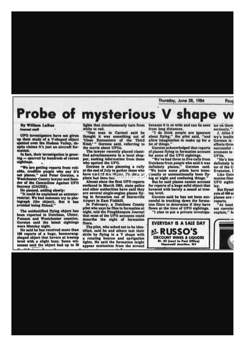 This newspaper article, published in the Poughkeepsie Journal on June 28, 1984, reports on a series of unidentified aerial phenomena (UAP) sightings occurring across the Hudson Valley, specifically in Dutchess, Ulster, Putnam, and Westchester counties. According to the report, investigators have collected over 100 accounts of a large, boomerang-shaped object that hovers at treetop level, often accompanied by a slight buzzing sound. Witnesses have described the object as having rotating beacon and navigation lights that shift from white to red. Peter Gersten, a Westchester County lawyer and founder of the Committee Against UFO Secrecy (CAUSE), is leading an investigation into these sightings and is planning a rally to collect further witness testimony. The article notes that Gersten is working with J. Allen Hynek, described as the country's leading UFO researcher. The report highlights the difficulty in obtaining photographic evidence, as the object has reportedly avoided being filmed. Additionally, a local pilot reported observing aircraft flying in a V-formation, which Gersten suggests may be a source of confusion for some observers, though he maintains that planes cannot account for reports of a large, solid object hovering at low altitudes.