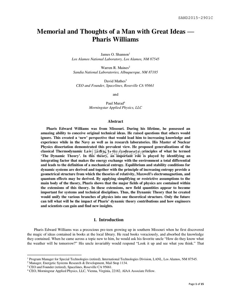This document is a memorial paper detailing the life and 'Dynamic Theory' of physicist Pharis Williams. It outlines his efforts to unify physics through thermodynamics and his practical applications in nuclear, shock, and photon physics.