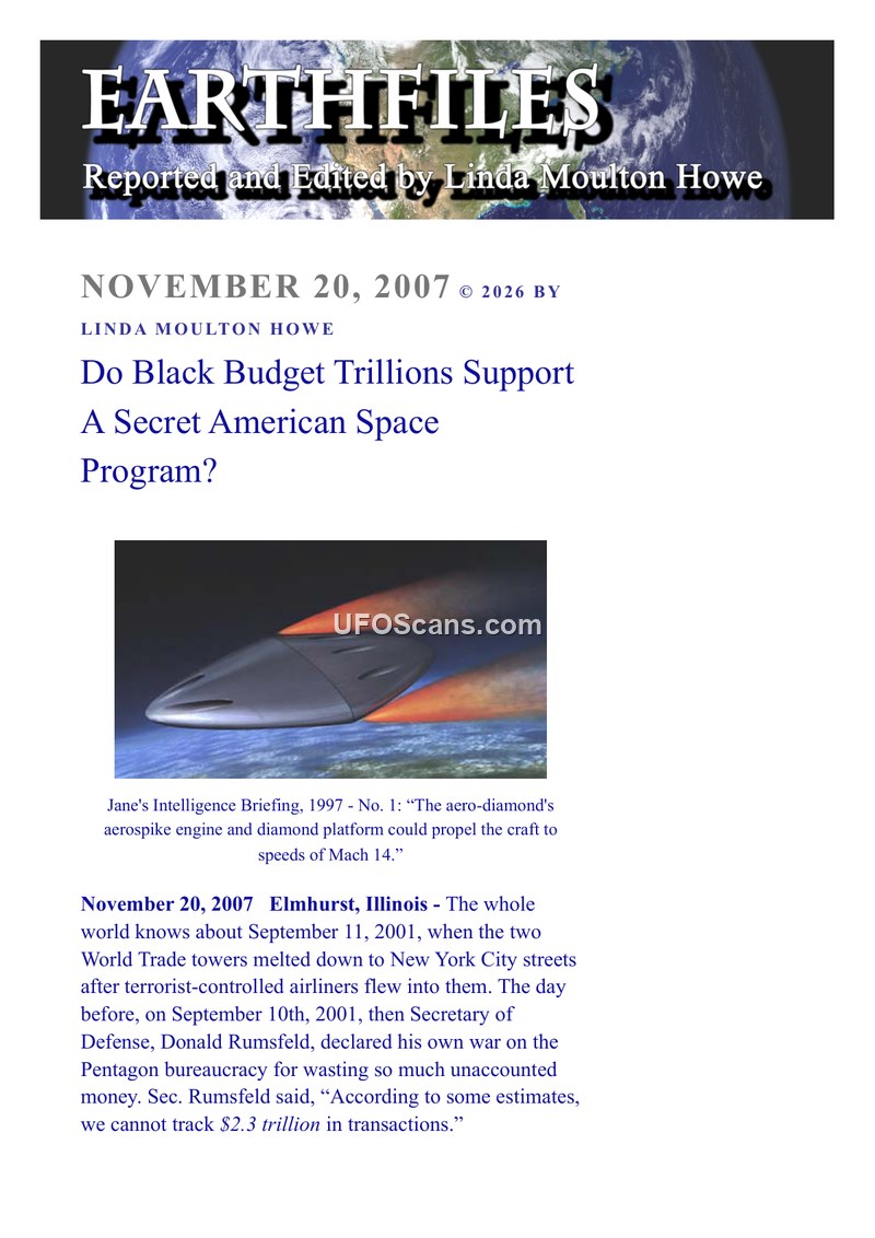 This report, authored by Linda Moulton Howe, explores the possibility that missing trillions in Pentagon funding are being utilized to support a secret American space program. The document draws a connection between a statement made by then-Secretary of Defense Donald Rumsfeld on September 10, 2001, regarding $2.3 trillion in unaccounted transactions, and historical claims of advanced, classified aerospace technology. The report references a specific incident on November 12, 1988, at Norton Air Force Base in California. According to aerospace researcher Michael Schratt, a diamond-shaped 'lifting body' was tested at the base. Schratt alleges that U.S. Senator Alan Cranston and Congressman George Brown Jr. were present for a demonstration of the F-117A, which allegedly served as a cover for an exhibit intended to garner support for black budget aerospace programs. An anonymous engineer claimed to have witnessed a football-sized, diamond-shaped craft covered in thermal tiles similar to those used on the Space Shuttle. This craft was described as an unmanned aerial vehicle capable of launching nuclear missiles. The document also references a 1997 Jane's Intelligence Briefing regarding an 'aero-diamond' craft with an aerospike engine capable of reaching Mach 14, further suggesting the existence of highly advanced, non-public aerospace capabilities.