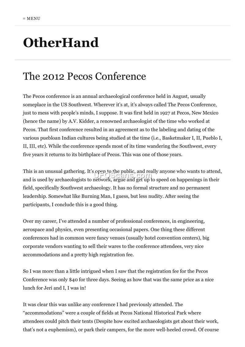 The document provides a personal narrative of the 2012 Pecos Conference and an archival summary of Robert Lazar's 1989 claims regarding Area 51 and reverse-engineered technology.
