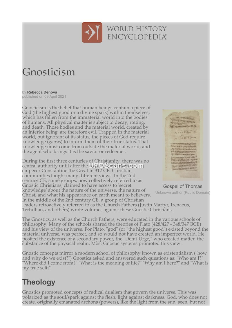 This document provides a historical overview of Gnosticism, a belief system that emerged during the early centuries of Christianity. Gnosticism posits that human beings possess a divine spark trapped within the material world, which is considered evil and created by an inferior being known as the Demi-Urge. Gnostics believed that salvation could only be achieved through secret knowledge (gnosis) that informs the individual of their true status and origin. The text details the conflict between Gnostic groups and the Church Fathers, who eventually established the concepts of orthodoxy and heresy to define and condemn Gnostic teachings. Key Gnostic writings, such as the Nag Hammadi Library, are discussed, including the Gospels of Thomas, Truth, Mary Magdalene, Philip, and Judas. These texts often present Jesus as an enlightened philosopher rather than a traditional messiah and emphasize individual salvation over church hierarchy. The document also explores the legacy of Gnostic concepts in modern philosophy, psychology, and science fiction, noting how themes of trapped souls and the illusion of the material world have influenced works like Blade Runner and The Matrix. An appended note links these ancient concepts to modern theories regarding a 'soul recycling system' and 'parasitical entities' known as Archons, as discussed by groups like the Farsight Institute and individuals such as Robert Monroe and Simon Parkes.