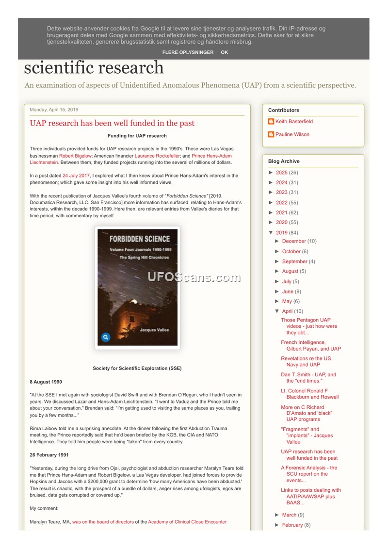 This document, a blog post dated April 15, 2019, by Keith Basterfield, examines the history of private funding for UAP research during the 1990s. Basterfield identifies three primary benefactors: Las Vegas businessman Robert Bigelow, American financier Laurance Rockefeller, and Prince Hans-Adam Liechtenstein. According to the author, these individuals collectively provided millions of dollars to support various UAP-related projects, including abduction studies and academic conferences. The text draws heavily from the diaries of Jacques Vallee, specifically his 'Forbidden Science' series, to provide context on the Prince's involvement and his views on the phenomenon. The document details several specific instances of this funding, such as a $200,000 grant provided to researchers Hopkins and Jacobs to survey American abduction experiences, an effort that became known as the 'Roper Poll.' It also mentions the Prince's interest in energy research and his support for the Society for Scientific Exploration (SSE). Furthermore, the document touches upon the internal dynamics of the ufology community, noting that the influx of large sums of money led to tensions, accusations of corrupted data, and concerns regarding the influence of wealthy donors on scientific institutions. The author also includes anecdotal information regarding the Prince's alleged briefings by the KGB, CIA, and NATO, as well as his interest in the work of physicist Fred Alzofon regarding gravity control. The document serves as a historical overview of private sector influence on UAP research during the late 20th century.