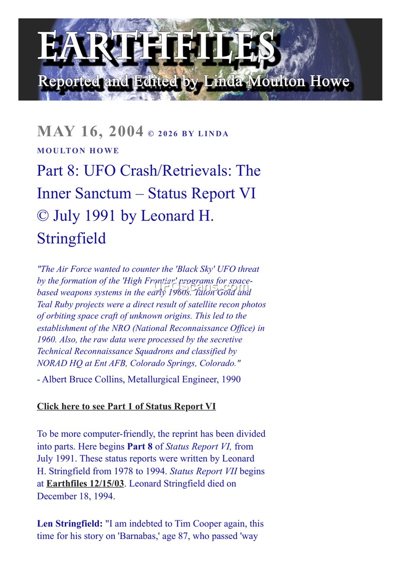 This document is a reprint of Part 8 of 'Status Report VI: UFO Crash/Retrievals: The Inner Sanctum,' originally written by Leonard H. Stringfield in July 1991 and published by Linda Moulton Howe on Earthfiles on May 16, 2004. The text features testimony attributed to metallurgical engineer Albert Bruce Collins, who discusses the United States Air Force's efforts to counter a 'Black Sky' UFO threat during the 1960s. According to the report, the Air Force established the 'High Frontier' programme and projects such as Talon Gold and Teal Ruby in response to satellite reconnaissance imagery of unknown orbiting spacecraft. These efforts contributed to the formation of the National Reconnaissance Office (NRO) in 1960. The document further notes that raw data from these activities were processed by Technical Reconnaissance Squadrons and classified by NORAD headquarters at Ent Air Force Base. Additionally, the document includes a narrative regarding the death of Albert Bruce Collins, also known as 'Barnabas,' who passed away on December 31, 1990, in Big Bear Lake, California. The report also references a retired Air Force Colonel who provided information to ufologist Tim Cooper regarding the recovery of flying discs in the Mojave Desert and New Mexico, suggesting that these objects were transported to Muroc Air Force Base and Langley for research by scientists including Von Braun, Condon, Oppenheimer, and Teller. The Colonel claimed that various projects, including a 'Project White Book,' investigated historical UFO sightings, including those allegedly documented by the Vatican.