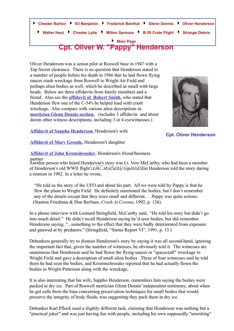 This document compiles testimonies and affidavits regarding the claims of Cpt. Oliver W. 'Pappy' Henderson, a senior pilot at Roswell Army Air Field in 1947. Henderson, who held a Top Secret clearance, reportedly told family members and associates that he had transported wreckage from a crashed UFO and the bodies of alien beings from Roswell to Wright Air Field (later Wright-Patterson) in Ohio. The document includes affidavits from his wife, Sappho Henderson; his daughter, Mary Kathryn Groode; and his business associate, John Kromschroeder. These accounts consistently describe Henderson's assertion that he saw small, humanoid bodies with large heads and slanted eyes, which he believed were recovered from a crash site. Sappho Henderson and Mary Groode recount that Henderson only felt comfortable discussing these events after seeing them reported in the media in the early 1980s. Additionally, the document references accounts from Lt. Vere McCarthy, a member of Henderson's WWII flight crew, who recalled Henderson mentioning the transport of wreckage and the deteriorated state of the bodies. The document also addresses and dismisses counter-claims by researcher Karl Pflock, who suggested Henderson was a 'practical joker.' The testimonies provide a consistent narrative of Henderson's claims, supported by the physical observation of a metal fragment by Kromschroeder, which he described as an unfamiliar, lightweight, and stiff alloy.