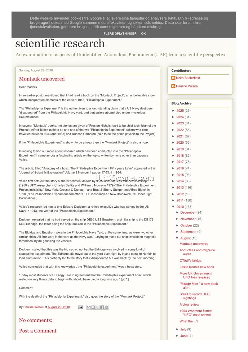 This document is a blog post dated August 29, 2010, by Pauline Wilson, discussing the 'Montauk Project' and its connection to the 'Philadelphia Experiment.' The author asserts that the Montauk Project is an 'unbelievable story' that relies on the validity of the earlier Philadelphia Experiment. To investigate the claims, the author references an article by Jacques Vallee titled 'Anatomy of a hoax: The Philadelphia Experiment Fifty years Later,' published in the 'Journal of Scientific Exploration' in 1994. Vallee's research involved interviewing Edward Dudgeon, a retired US Navy executive who served in 1943. Dudgeon clarified that he served on the USS Engstrom, a ship similar to the USS Eldridge, which is central to the Philadelphia Experiment legend. Dudgeon explained that the ships were in the Philadelphia Navy Yard for de-gaussing, a process intended to make vessels invisible to magnetic torpedoes. He stated that the Eldridge traveled to Norfolk overnight to load ammunition, which likely gave rise to the myth that the ship had disappeared. Based on this, Vallee concluded that the Philadelphia Experiment was a hoax, and the author of the blog post suggests that the Montauk Project story is similarly invalid. The document also includes context regarding the Department of Energy's involvement in UAP-related records and mentions various other UAP-related topics in the blog's sidebar.