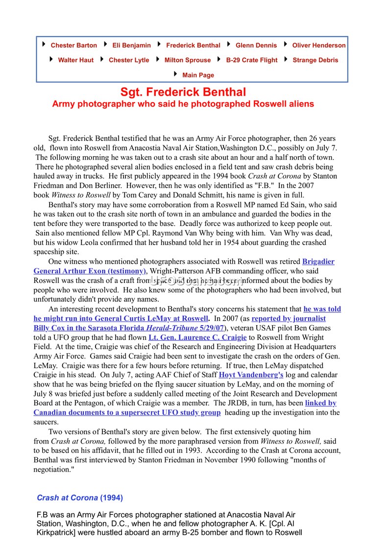 This document compiles the testimony of Sgt. Frederick Benthal, an Army Air Force photographer who claimed to have been flown from Anacostia Naval Air Station to Roswell, New Mexico, in early July 1947. According to Benthal, he and fellow photographer Cpl. Al Kirkpatrick were taken to a crash site north of town, where they were instructed to photograph several alien bodies inside a dark, rubber-lined tent. Benthal described the bodies as having dark complexions, thin frames, and large heads. He stated that he took approximately thirty photographs using a Speed Graphic camera before his equipment and film were confiscated by military authorities. The document also references corroborating claims from an MP named Ed Sain, who reported guarding the site, and discusses the potential involvement of high-ranking officials such as General Curtis LeMay and Lt. Gen. Laurence C. Craigie in the investigation of the incident. The text notes that Benthal was first publicly identified as 'F.B.' in the 1994 book 'Crash at Corona' and later by name in the 2007 book 'Witness to Roswell'. The document concludes by noting that Benthal and Kirkpatrick were debriefed upon their return to Anacostia and instructed not to discuss what they had seen.