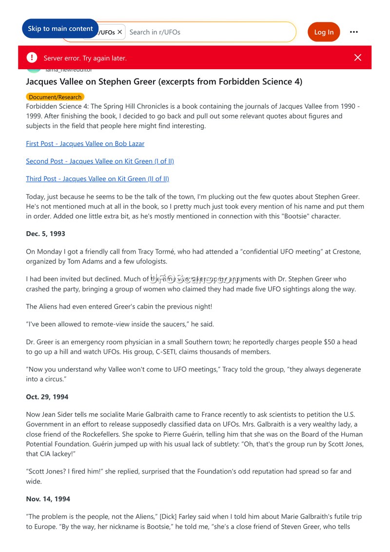 This document consists of a compilation of journal entries written by Jacques Vallee between 1993 and 1999, focusing on his observations of Dr. Stephen Greer and the broader ufology community. Vallee characterizes Greer as an emergency room physician who, through his organization C-SETI, claims to facilitate contact with extraterrestrials. Vallee expresses skepticism regarding Greer's methods, noting that Greer often crashes meetings and claims to have remote-viewed inside saucers. The journals detail the involvement of wealthy figures such as Marie Galbraith and Laurance Rockefeller in funding various UAP-related projects, including the Human Potential Foundation and Project Starlight. Vallee documents the internal dynamics of these groups, noting that they often operate with a belief in an impending 'Big Disclosure' or a revolution led by 'good' aliens. The entries also mention interactions with other figures such as John Petersen, Edgar Mitchell, and Scott Jones, highlighting the interconnected nature of these circles. Vallee frequently contrasts his own research approach with the 'circus' atmosphere he perceives in Greer's activities. The document also includes a collection of Reddit comments from 2021, where users discuss Vallee's journals and express critical views of Greer, often labeling his claims as fraudulent or cult-like. The archive concludes with a brief reference to a 1994 incident at Boscombe Down involving a potential crash of a triangular aircraft, possibly the 'ASTRA' or 'Aurora'.