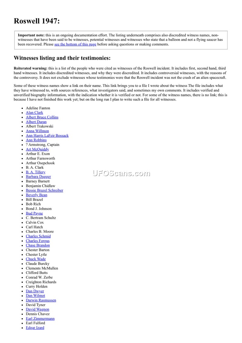 The document serves as an ongoing, non-exhaustive compilation of individuals cited as witnesses to the 1947 Roswell incident. The author explicitly includes discredited witnesses, individuals who claim a balloon was recovered, and those who provided second or third-hand accounts. The list is maintained as a subjective, ongoing project intended to document all claims, including contradictory ones, to assist readers in forming their own opinions.