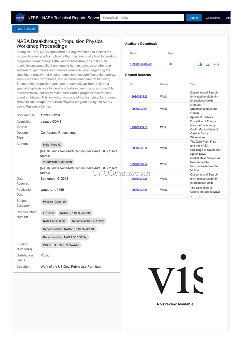 This document consists of the proceedings from a NASA Breakthrough Propulsion Physics workshop held in August 1997. The three-day event was organized to assess emerging physics concepts that could potentially revolutionize space flight and enable human travel to other star systems. The workshop served as a foundational step for the NASA Breakthrough Propulsion Physics program, which was led by the NASA Lewis Research Center. Discussions during the workshop covered a range of advanced theoretical and experimental topics, including the coupling of gravity and electromagnetism, vacuum fluctuation energy, warp drives, wormholes, and superluminal quantum tunneling. Recognizing that these propulsion goals were far from immediate realization, the workshop placed a special emphasis on identifying research tasks that were affordable, near-term, and credible. The document notes that twelve students were in attendance. Additionally, the archive context mentions that Salvatore Pais, who later became known for his work on the Navy’s triangle craft patent, was working on his PhD at Case Western Reserve University and serving as a NASA Graduate Student Research Fellow at the Glenn Research Center during the time of the workshop, though it is not explicitly confirmed if he attended the event.