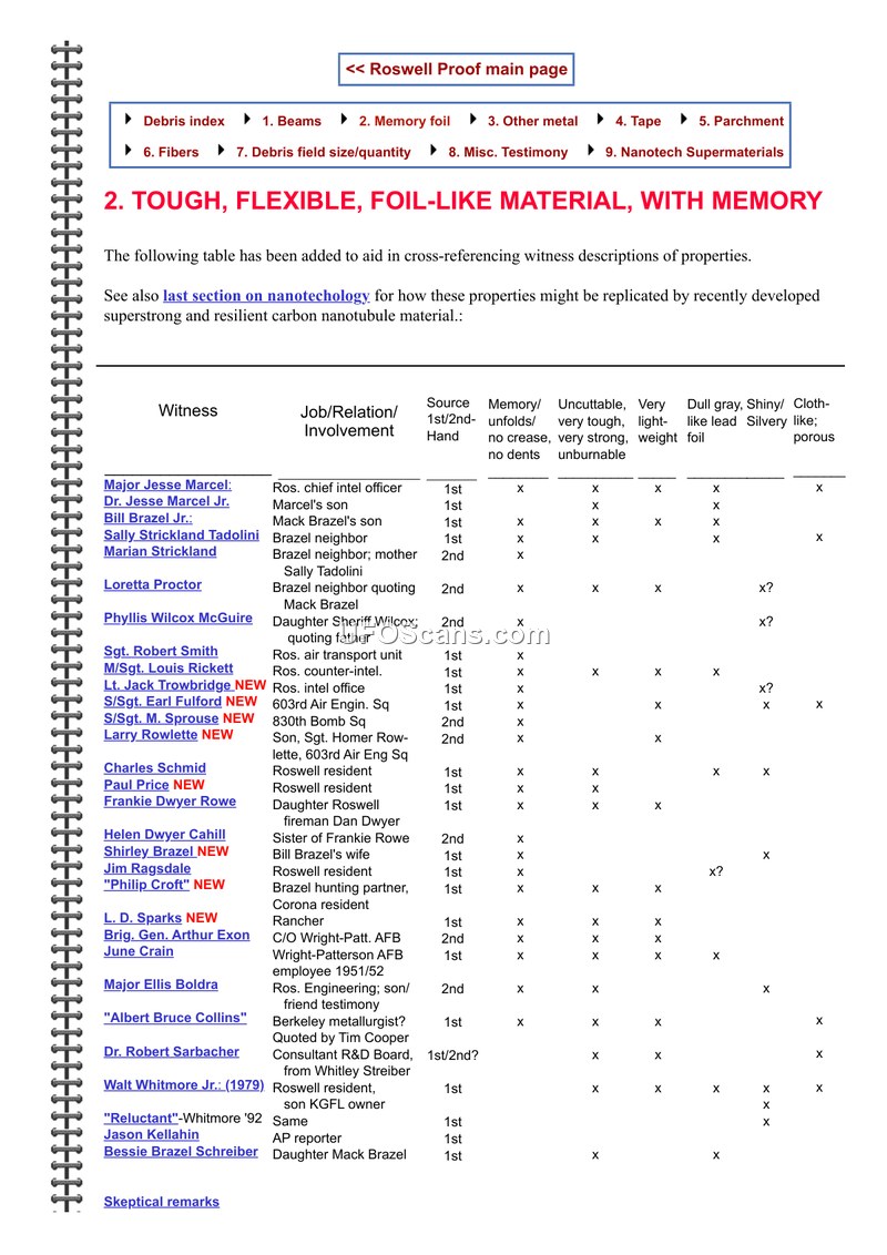 This document serves as a reference compilation for witness testimonies regarding the physical properties of debris recovered in the vicinity of Roswell, New Mexico, in July 1947. The primary focus is on a specific material described as 'memory foil' or a tough, flexible, foil-like substance. Numerous witnesses, including military personnel such as Major Jesse Marcel and S/Sgt. Earl V. Fulford, as well as civilians like William Brazel Jr. and Frankie Dwyer Rowe, provide consistent accounts of the material's unique characteristics. These include its ability to be crumpled into a ball and immediately return to its original shape without creases, its resistance to tearing, cutting, or burning, and its extremely low weight. Some witnesses describe the material as having a dull gray or silvery appearance, sometimes comparing it to lead foil or quicksilver, while others note a cloth-like or porous texture. The document also includes skeptical perspectives, such as those from Charles B. Moore, who suggests the debris may have been part of a Mogul Project radar reflector, though witnesses often explicitly contrast the recovered material with standard weather balloon components. The compilation highlights the persistent nature of these reports, with various individuals recounting their experiences decades later, often emphasizing that the material was unlike anything they had encountered before or since.