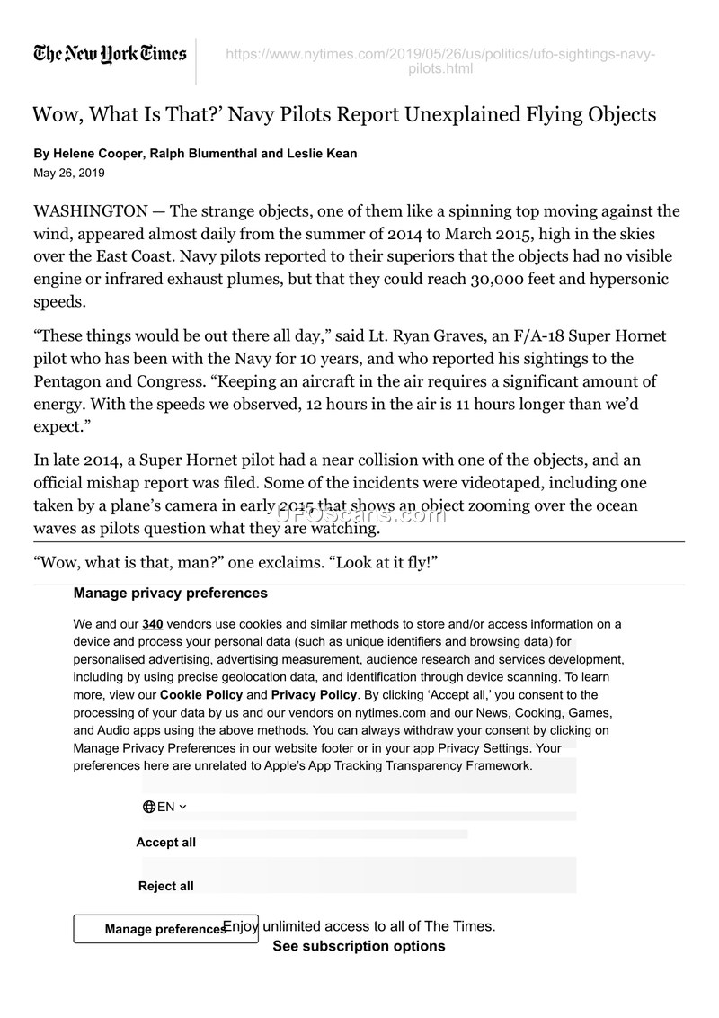 This article, published by The New York Times on May 26, 2019, details reports from United States Navy pilots regarding unexplained aerial phenomena observed along the East Coast between the summer of 2014 and March 2015. Pilots, including Lt. Ryan Graves, described objects that appeared to move against the wind and exhibited performance characteristics—such as reaching 30,000 feet and achieving hypersonic speeds—that exceeded known aircraft capabilities. These objects lacked visible engines or infrared exhaust plumes. One specific incident in late 2014 involved a near-collision between a Super Hornet and one of the objects, resulting in an official mishap report. Some encounters were captured on video by aircraft cameras. While the Defense Department has not attributed these sightings to extraterrestrial origins and maintains that earthly explanations are often possible, the frequency and nature of the sightings prompted the Navy to issue new classified guidance for reporting such unexplained aerial phenomena. The pilots involved, who operated out of the aircraft carrier Theodore Roosevelt during training maneuvers from Virginia to Florida, have made no claims regarding the origin of the objects.
