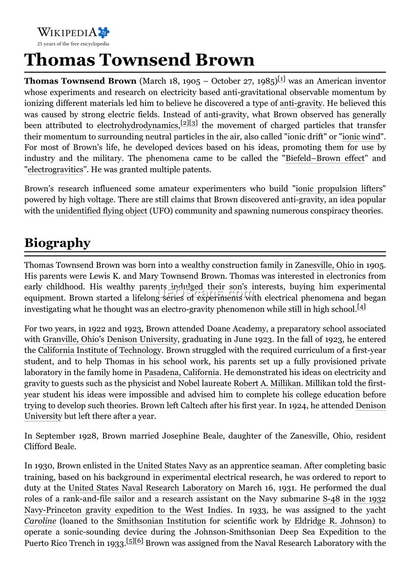 Thomas Townsend Brown was an inventor who claimed to have discovered an anti-gravity effect, later termed 'electrogravitics.' Scientific consensus attributes his observations to ionic wind, and his work has become a subject of interest within UFO and conspiracy theory communities.