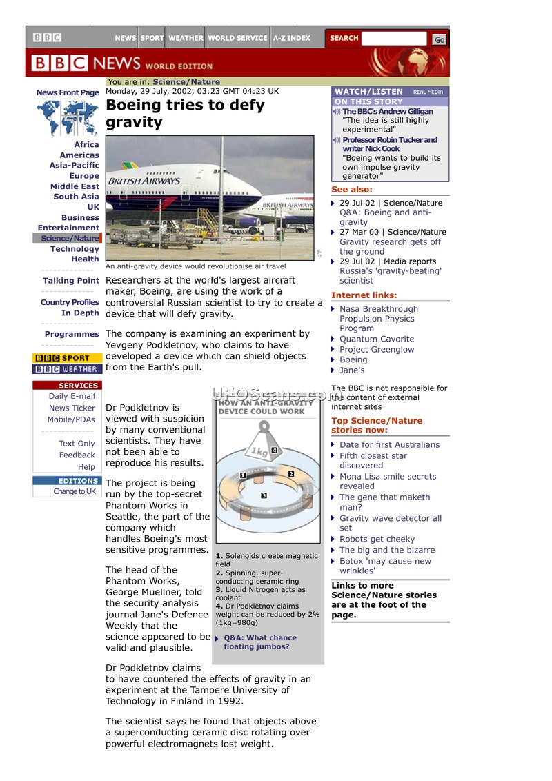 This document, a BBC News report dated 29 July 2002, details efforts by the aerospace company Boeing to investigate anti-gravity technology. The report highlights that Boeing's 'Phantom Works' division in Seattle is examining experimental work originally conducted by Russian scientist Yevgeny Podkletnov at the Tampere University of Technology in Finland in 1992. Podkletnov claimed that objects positioned above a rotating, superconducting ceramic disc subjected to powerful electromagnets experienced a reduction in weight. Although many conventional scientists remain skeptical and have been unable to replicate these results, George Muellner, the head of Phantom Works, reportedly told Jane's Defence Weekly that the science appeared valid and plausible. The document notes that Boeing is testing this hypothesis under a programme codenamed 'Project Grasp' (Gravity Research Applied to Space Propulsion). Furthermore, the report mentions that other institutions are pursuing similar research, including the UK's BAE Systems, which is working on a programme called 'Project Greenglow,' and NASA, which has attempted to replicate Podkletnov's findings, though a preliminary report suggested the effect does not exist. The article emphasizes the potential implications of such technology for aviation, specifically regarding the reduction of energy required for flight.