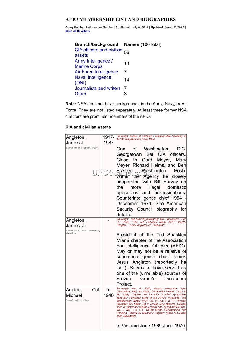 This document is a compilation of membership lists and biographical sketches of individuals associated with the Association of Former Intelligence Officers (AFIO), prepared by Joël van der Reijden. The document provides detailed profiles of 100 individuals, categorized by their professional backgrounds, including CIA officers and civilian assets, Army and Marine Corps intelligence personnel, Air Force and Naval intelligence officers, and journalists or writers. The biographies focus on the careers, affiliations, and controversial activities of these individuals, often highlighting their roles in covert operations, intelligence programs, and political influence networks. Key figures profiled include James J. Angleton, George H. W. Bush, William J. Casey, William E. Colby, and various military and intelligence leaders. The document frequently references connections between these individuals and broader intelligence networks, such as the 'Georgetown Set,' the 'Safari Club,' and private security firms like Blackwater. It also details involvement in specific programs, including MKULTRA, the Phoenix Project, and various remote viewing initiatives. The biographies are heavily annotated with source citations, including news articles, books, and official reports, to support the claims made regarding the subjects' professional histories and alleged involvement in sensitive or controversial activities. The document serves as a reference for understanding the interconnected nature of the U.S. intelligence community and its influence on political and military affairs over several decades.