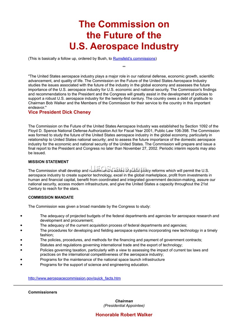 The Commission on the Future of the U.S. Aerospace Industry was a congressionally mandated body established by Public Law 106-398 to assess the industry's role in national security and economic growth. It was tasked with recommending policy reforms to ensure the industry's competitiveness and technological superiority.