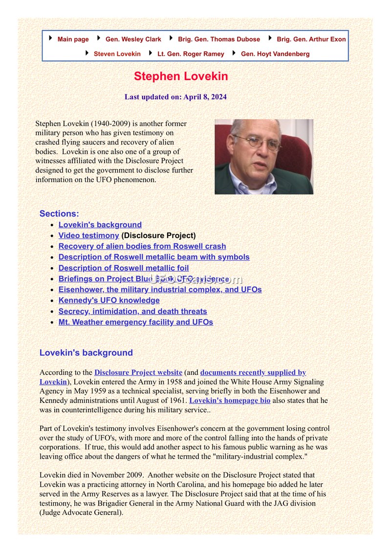 This document provides an overview of the testimony of Stephen Lovekin (1940-2009), a former military member who served in the White House Army Signaling Agency between 1959 and 1961. Lovekin, associated with the Disclosure Project, claimed to have received briefings at the Pentagon regarding UFOs and extraterrestrial bodies recovered from a crash in New Mexico. He alleged that there were between three and five bodies recovered, one of which was partially alive. Lovekin also described witnessing a metallic object resembling a yardstick, which featured symbols of instruction or encryption, during a meeting regarding Project Blue Book materials. He asserted that the military was engaged in reverse engineering efforts related to such materials. Lovekin further claimed that President Dwight D. Eisenhower was concerned about the government losing control of the UFO phenomenon to private corporations, a concern he linked to Eisenhower's warning regarding the military-industrial complex. Lovekin alleged that the government enforced strict secrecy through intimidation and threats of being 'erased.' The document also notes that Lovekin's claimed rank of Brigadier General was actually held within the North Carolina State Guard, a voluntary militia, rather than the official National Guard. The text includes excerpts from interviews with researcher Grant Cameron and references to Mt. Weather as a facility with equipment specifically set up to deal with UFOs.